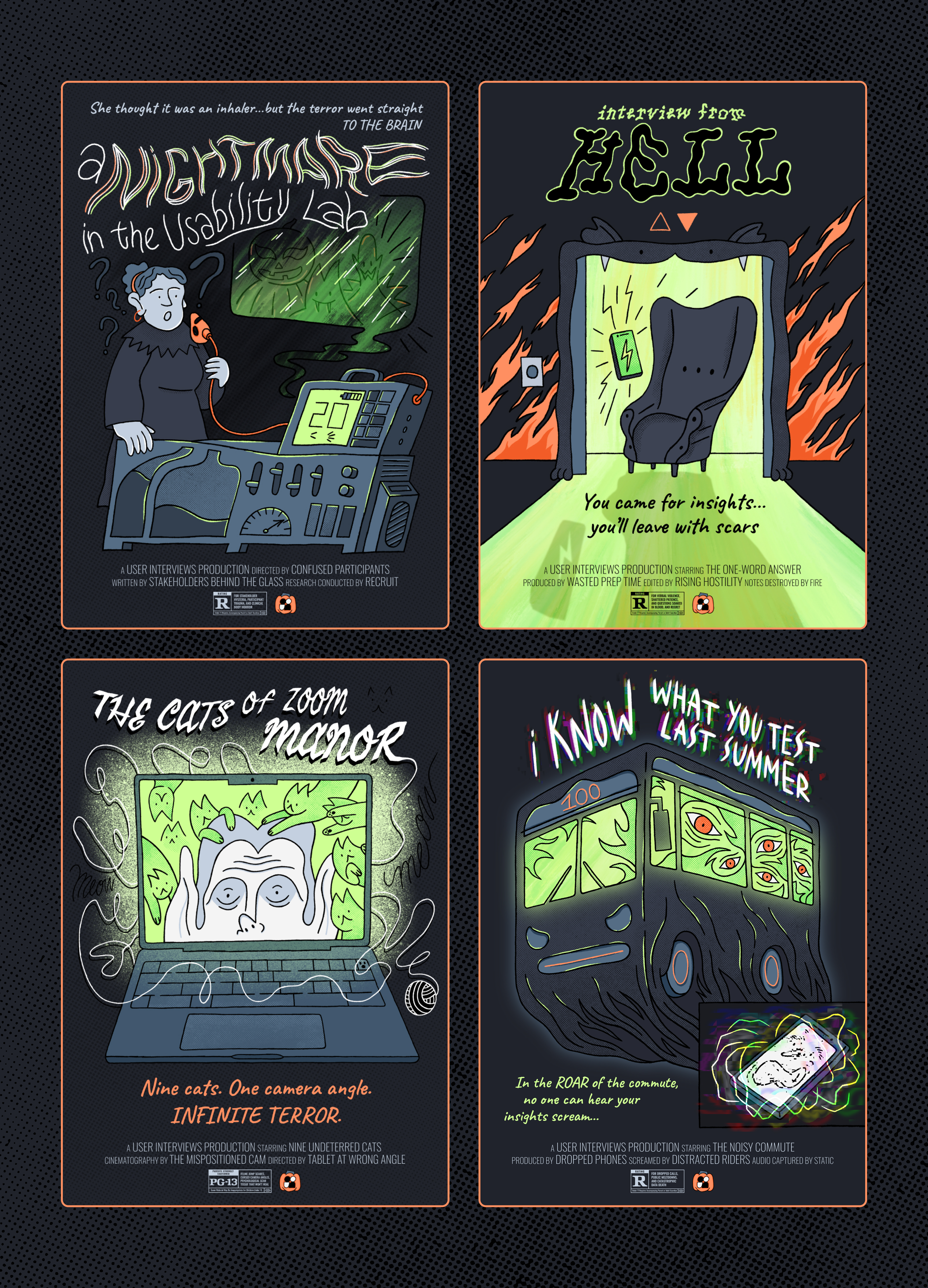 Overview: Research Stories Posters Collection brings to life the eerie side of user research. Each poster reimagines a true story of research gone wrong, transforming it into a cinematic horror-style collectible :)